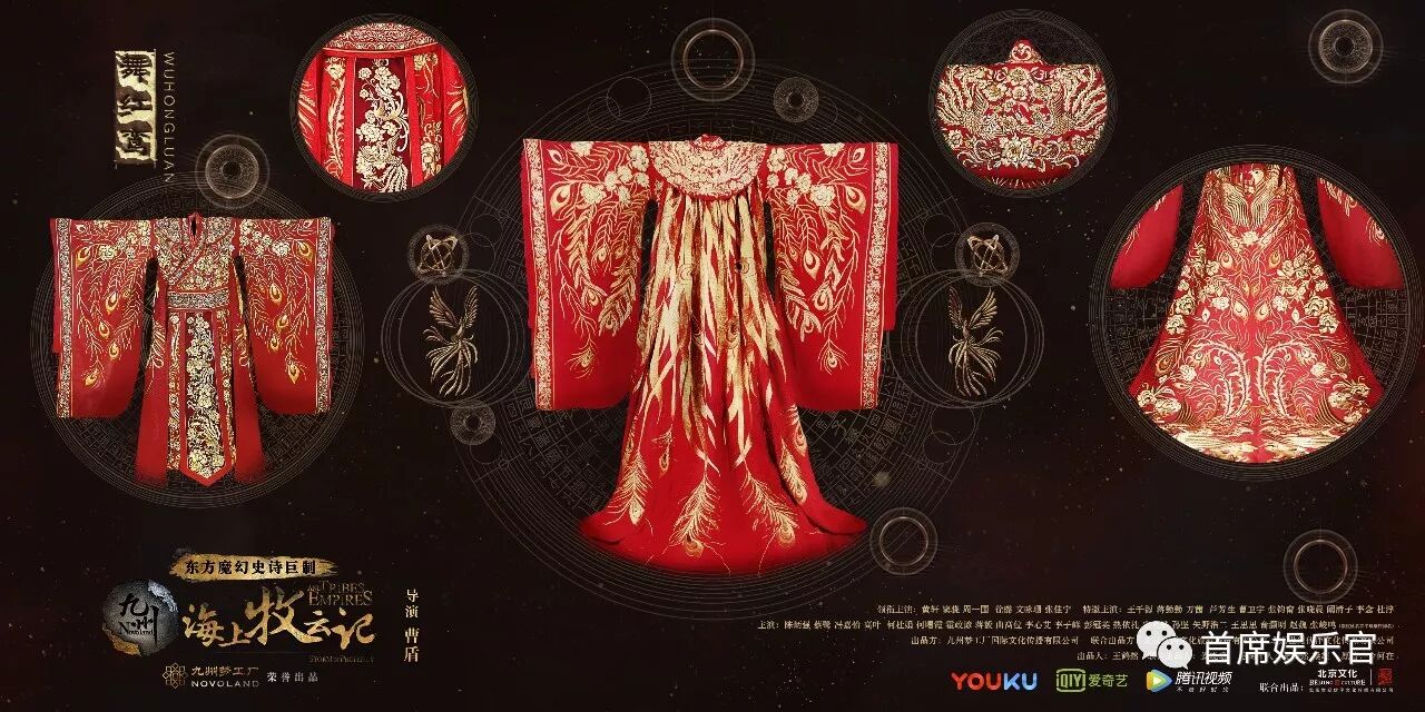 苏语凝大婚时所穿着的红色礼服,其面料的挑选、手工的染色、纹样的配绣、制作,每一样超过几百个小时。皇后所穿的服饰,以黑色为底色,再以金丝刺绣纹路于其中,凸显其地位的同时,也暗合了该人物的性格特点。创作团队曾发布了7套命名别致的服装,其背后也富有深意。如苏语凝大婚的喜服,称为“舞红鸾”,取意“黹赤金繁花,衔凰仪,心不嫁”,便和其纠缠的个人情感、复杂的人物命运相契合。
