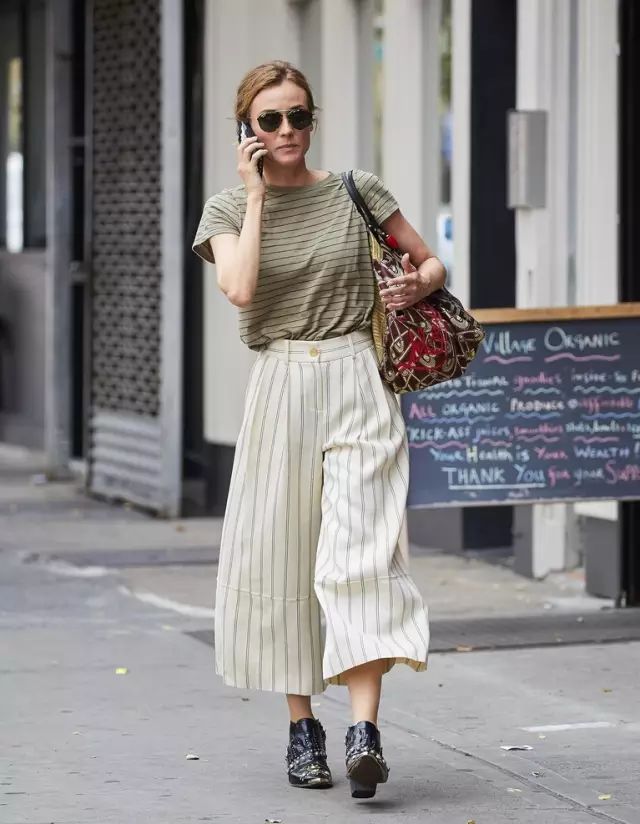 下穿白色条纹阔腿裤,脚踩黑色铆钉休闲鞋