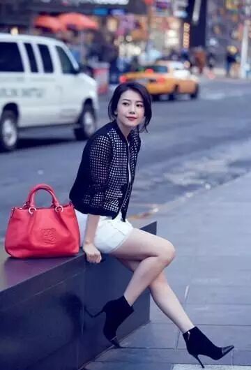手拎Balenciaga黑色机车包,下穿黑色legging,脚踩红色短靴