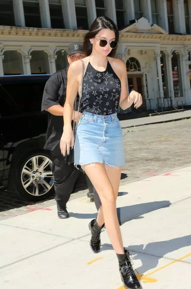 身穿蓝色牛仔内衣,外搭黑色亮片流苏夹克