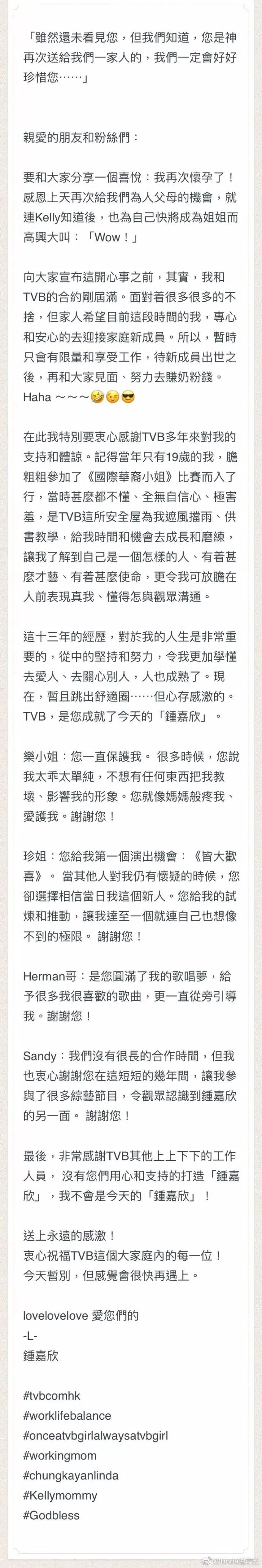 另外,嘉欣亦在脸书贴上一家三口及超声波照,以长文公布:「要和大家分享一个喜悦:我再次怀孕了!感恩上天再次给我们为人父母的机会,就连Kelly知道后,也为自己快将成为姐姐而高兴大叫:『Wow!』」同时,她亦宣布跟TVB合约刚届满,虽然不舍但可专心和安心去迎接家庭新成员,然后逐一感谢入行这13年来对她非常重要的人。