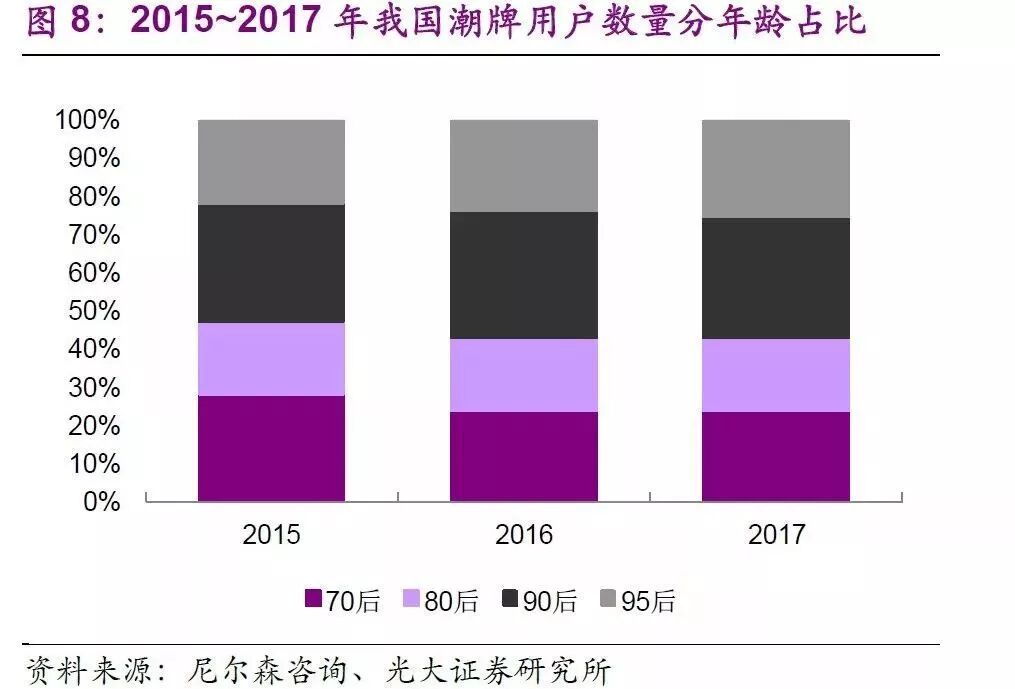 90后和95后是潮牌的主要消费群体,且95后三年来占比逐渐攀升至25%。
