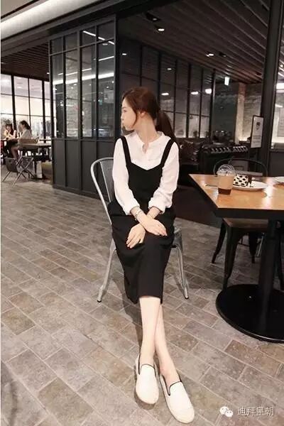 1、白色衬衫+黑色背带裙+白色乐福鞋