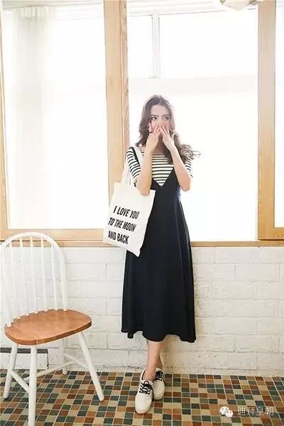 2、条纹T恤+黑色背带裙+运动鞋+白色休闲布包