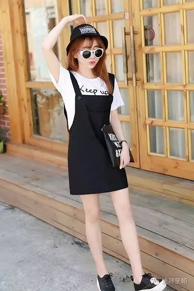 黑色的背带裙和T恤搭配穿起来看上去特别的女性化,T恤温柔的线条和略带小清新的设定,让人看上去温柔又不失气质。