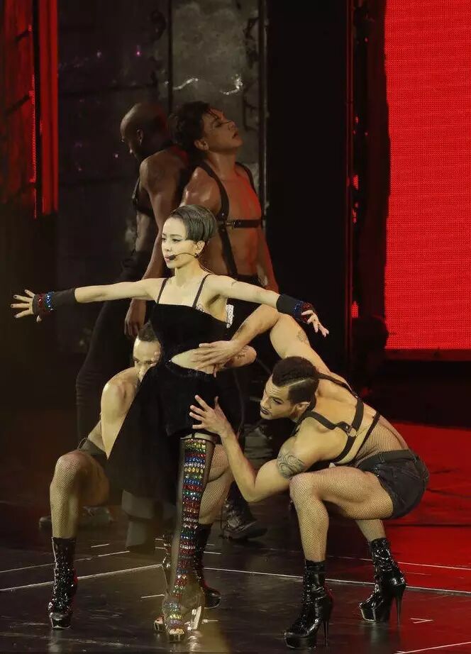 蔡依林4月30日晚举行澳门站巡唱,以黑色火辣造型登场,虽然性感欠奉,但蔡依林连串劲歌热舞令全场嗨翻。