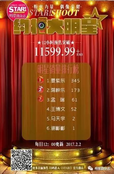 《STAR!明星微杂志》创刊四周年“约拍大明星”封面计划,首轮入围明星:晏紫东、蒋梓乐、孟瑞、王博文、许魏洲、黄景瑜、蔡照、陈秋实、高泰宇、黄靖翔。每位偶像为期7天的票选,全宇宙召唤1000+位粉丝线上支持预售封面。