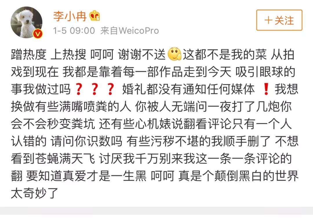 在李小璐的八卦纷纷扰扰的时候,有一些非常爱抖机灵的网友就去李小冉的微博下,故意装成认错人去惹她,果然,对网络无聊游戏没有任何经验的李小冉就上当了,不但在回复中问网友:你认识字吗?还自己发了一条微博强调自己叫李小冉冉冉冉。