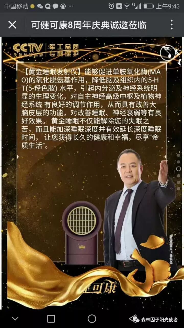由上海计量测试研究院,华东国家计量测试中心,中国上海测试中心对青岛可健可康公司研制的黄金睡眠发射仪测试报告,每立方厘米释放负氧离子是960O万个,是德国同类产品的4倍多,(德国每立方厘米释放2100万个),是日本的5倍多(日本每立方厘米释放1700万个),在负氧离子领域创造了世界第一,青岛可健可康公司承诺,有高血糖,高血压,糖尿病,鼻炎,哮喘,咽炎,严重失眠免等病人,免费使用可健可康黄金睡眠发射仪一个月,如达不到你要的效果公司无条件退货,产品好不好看疗效,黄金睡眠发射仪就是这么牛!!!