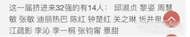 看看这一届的32强和上一届的,挤进来的有下面14人,会发现除了邱淑贞、黎姿这样的经典气质女神,还有很多新势力,比如李一桐、李沁、迪丽热巴和景甜。
