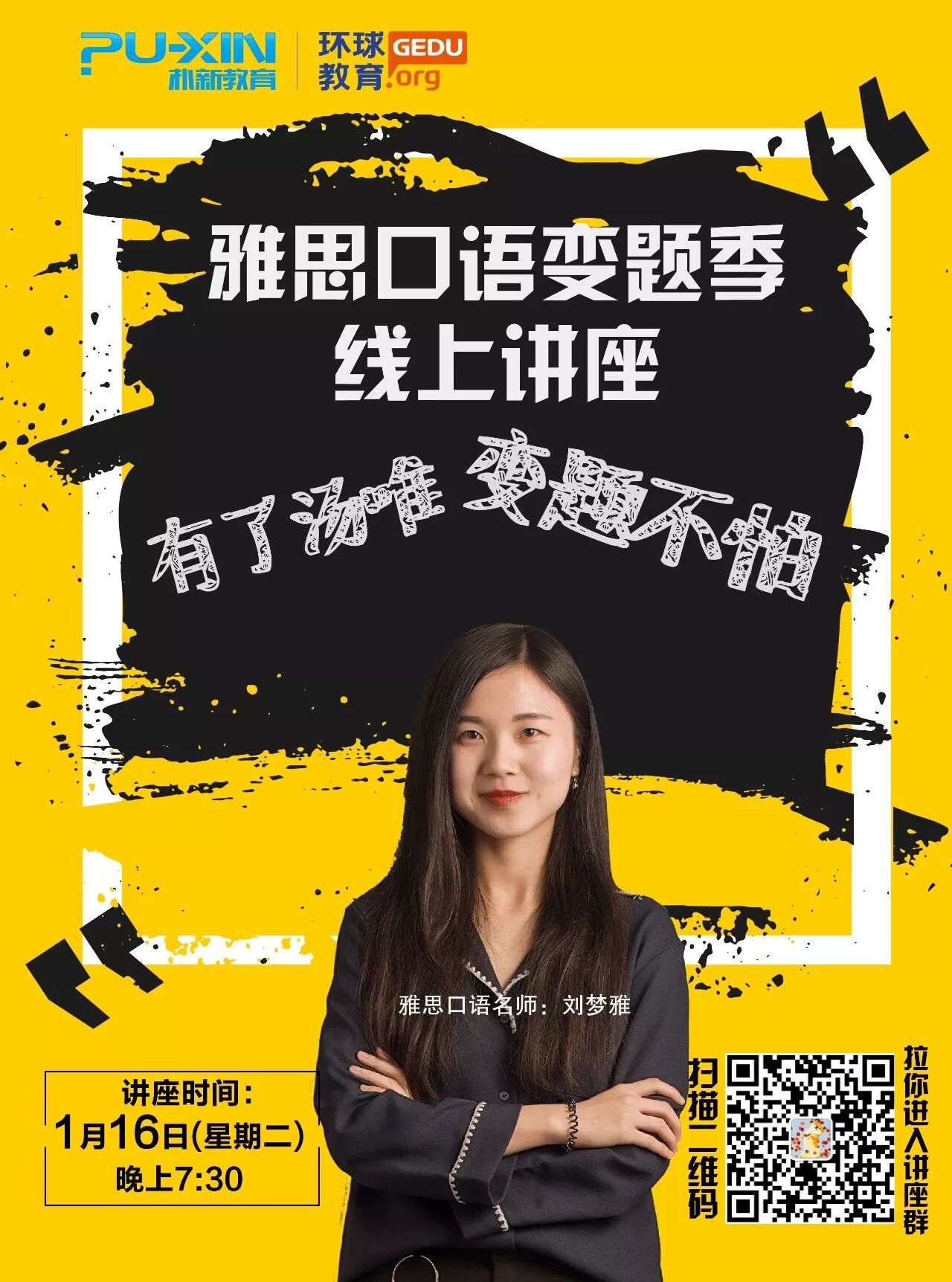 1月16日晚上7点30分,雅思口语变题季线上讲座,梦雅老师与你不见不散哦!