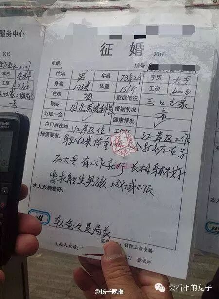 【男子自称局长儿子 征婚要求女方能生男孩】近日,武汉解放公园征婚角的一条征婚启事引人注意,在启事择偶要求一栏,征婚者胡先生要求女方“能生男孩”。并且,在启事的最后,胡先生还说明“本人爸爸是局长”。多位市民表示很奇葩,目前还没有女士愿意跟该男子相亲。你怎么看?