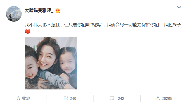 吴雅婷在微博上大量的主题活动便是共享小孩一日三顿和小朋友们的美好时光。为了爱两个和王栎鑫的小孩,她是花尽了一辈子的精力来爱的。