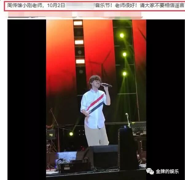 同时,周传雄身边的工作人员也在社交网站上晒出了周传雄身体健康的实锤,堵住了悠悠众口,照片中周传雄老师正在参加一个音乐活动,而在晒出照片的同时,工作人员也不断表示周传雄老师现在很好,请大家不要相信谣言。其实在这个网络信息说话不用负责任的时代,经常会冒出一些莫名其妙的谣言,周传雄老师也是无辜躺枪了。