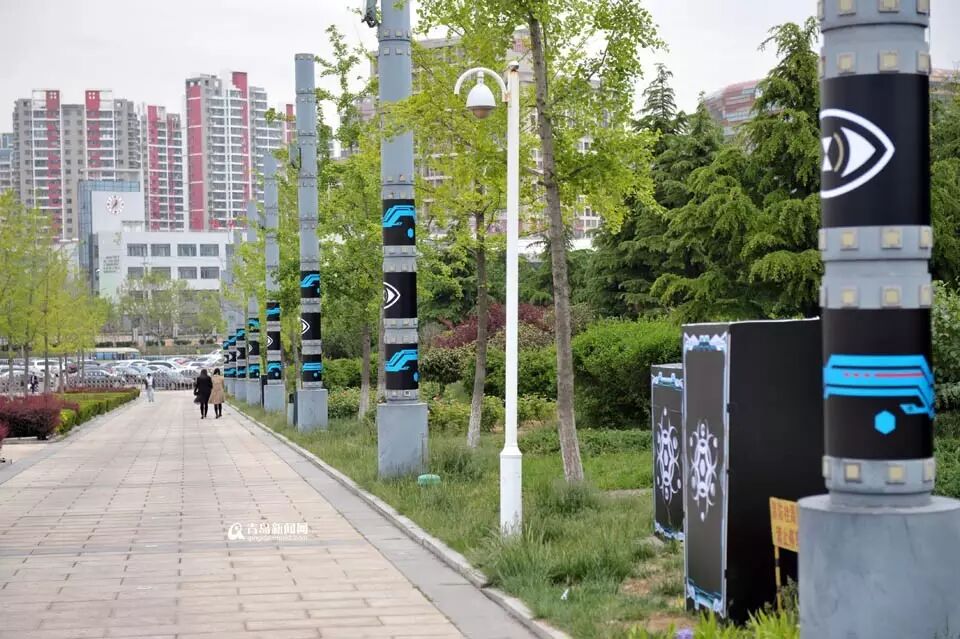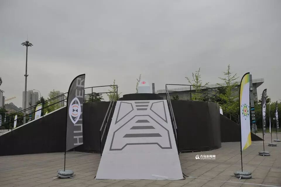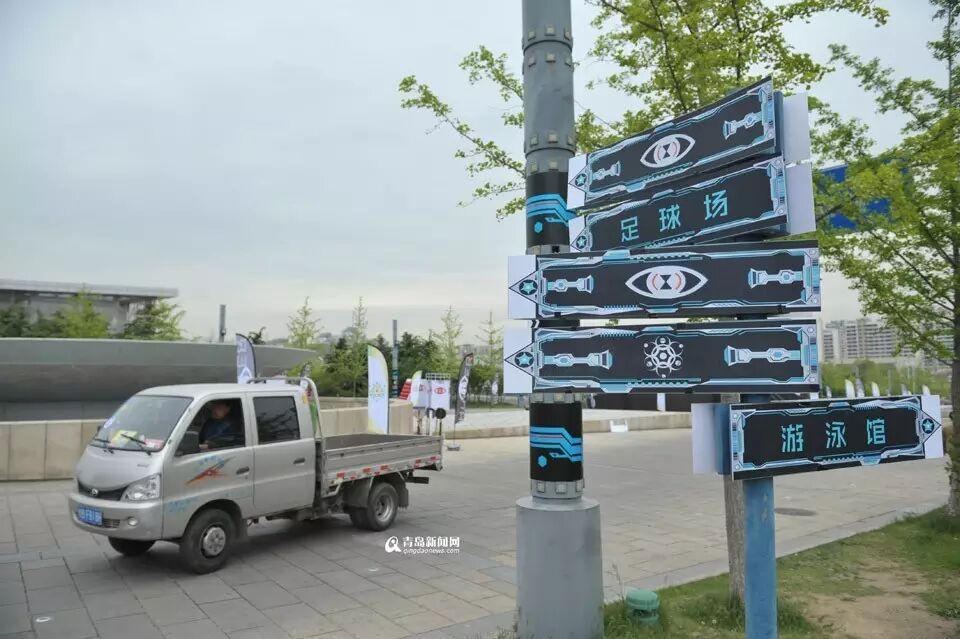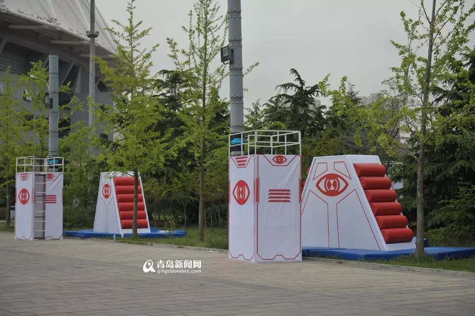 道路中央搭建了一个巨大的舞台,此外还有一些已经组建好了的大型游戏道具摆放在路旁。