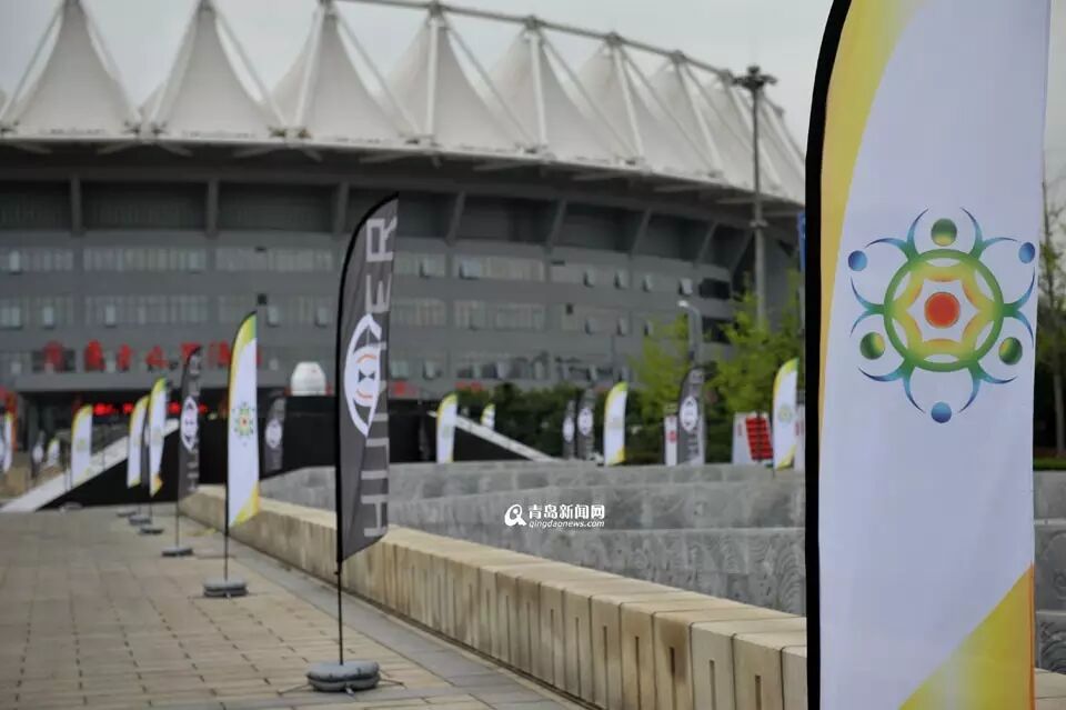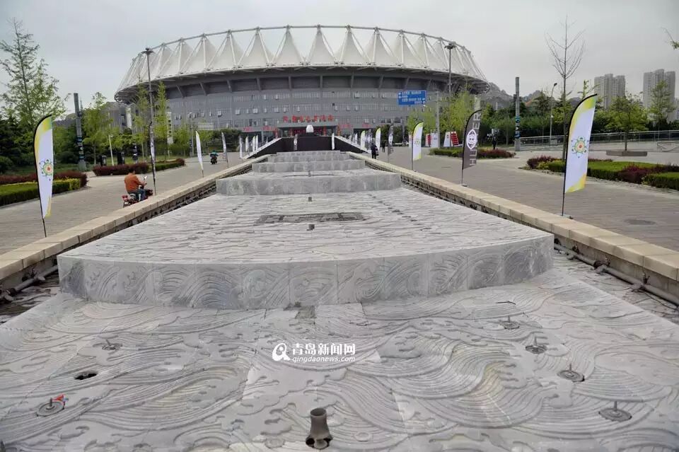 目前节目组人员正在紧张的布景中,喷泉两侧插满了路旗。