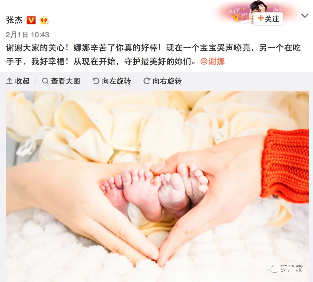随后张杰也发微博确认消息,还附上倆千金小脚丫的照片,夫妻两人的大手则爱心呵护。也是很温馨了!