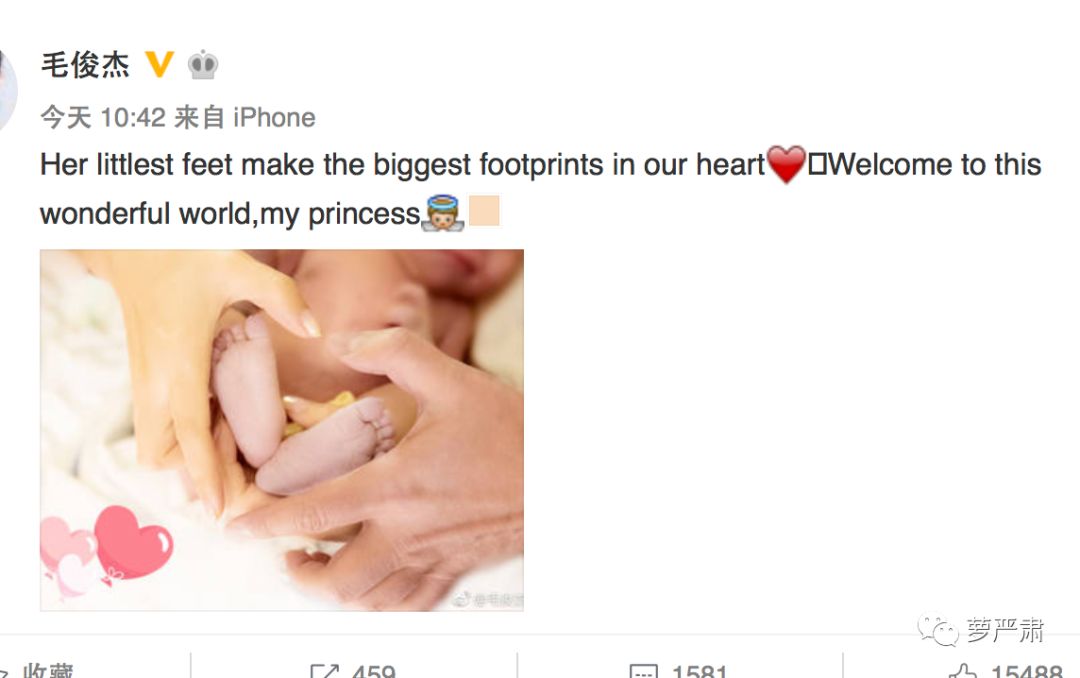 演员毛俊杰晒晒宝宝小脚丫宣布当妈妈,看这全英微博,有网友猜测老公可能是外国人。