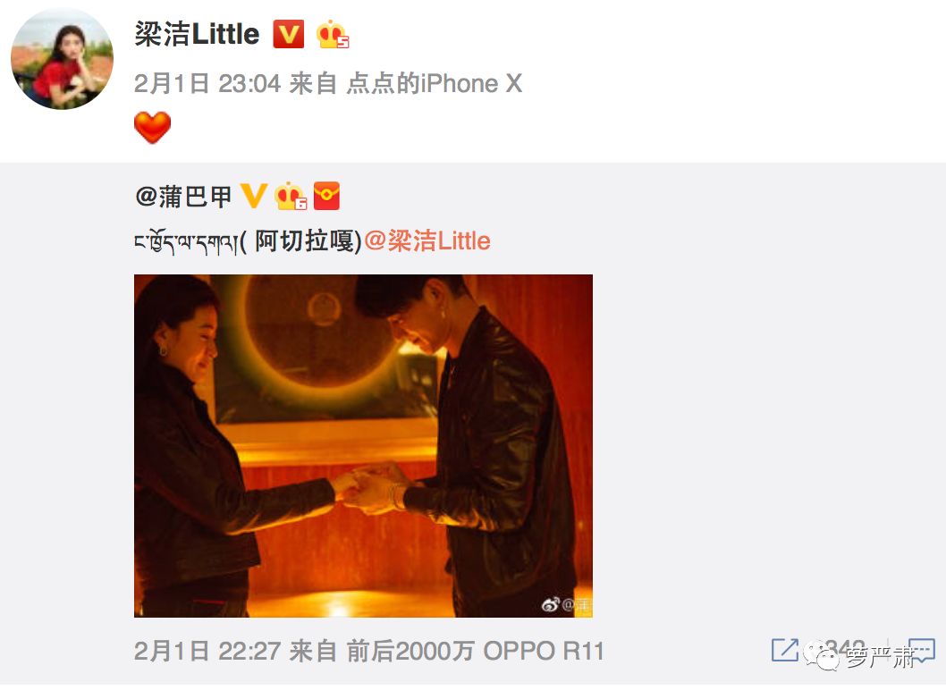 昨晚蒲巴甲在微博宣布自己成功求婚梁洁,晒出现场照片,并配文:“ 阿切拉嘎!(藏语我爱你)@梁洁Little ”