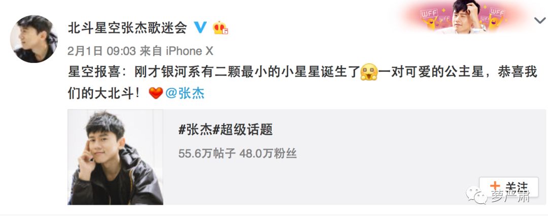 昨天上午9点,张杰粉丝会官方微博首先放出喜讯:“星空报喜:刚才银河系有二颗最小的小星星诞生了一对可爱的公主星,恭喜我们的大北斗!”