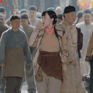 剧中,为了卖掉囤积的布匹,周莹决定抢占迪化的布匹市场,沈星移知道后也一路相随,在途中休息时,周莹拿着鞭子抽打一棵开花的树,风刚好吹来,花飘落一地,周莹回眸大笑,十分洒脱唯美。沈星移看着树下的周莹,终于痴了。