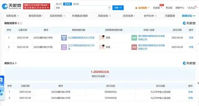 据风险信息显示,此前郑爽及两工作室已因上述案件被强制执行约1.28亿元。