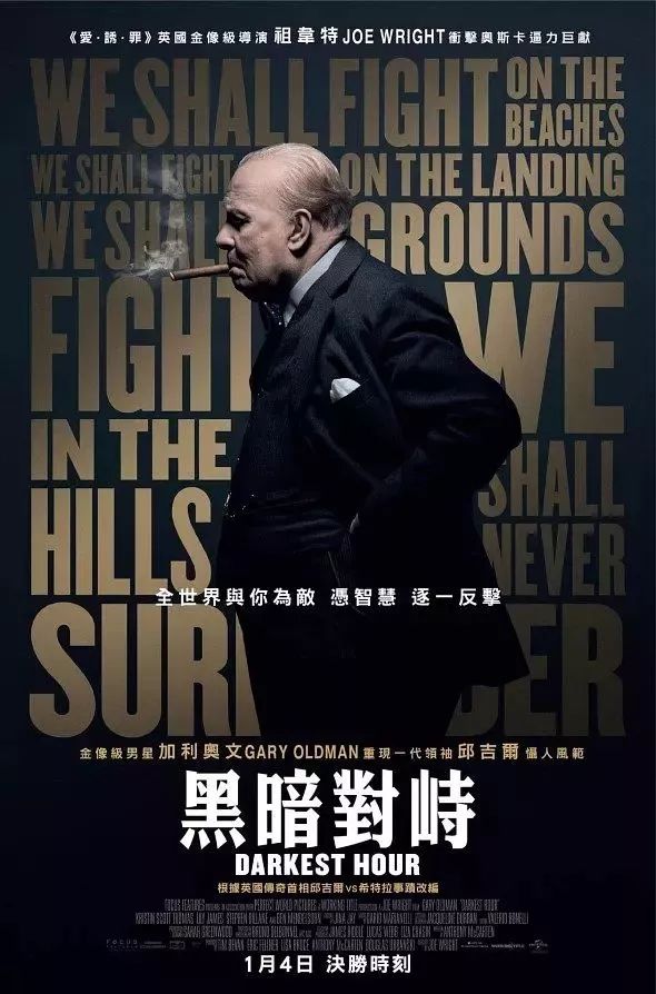 《至暗时刻》香港海报 乔·赖特执导 2017年9月10日在多伦多国际电影节上映 该片讲述二战时期,英国首相丘吉尔的故事