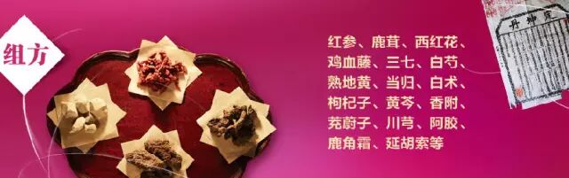 红参、鹿茸、西红花、鸡血藤、三七、白芍、熟地黄、当归、白术、枸杞子、黄芩、香附、茺蔚子、川芎、阿胶、鹿角霜、延胡索等。