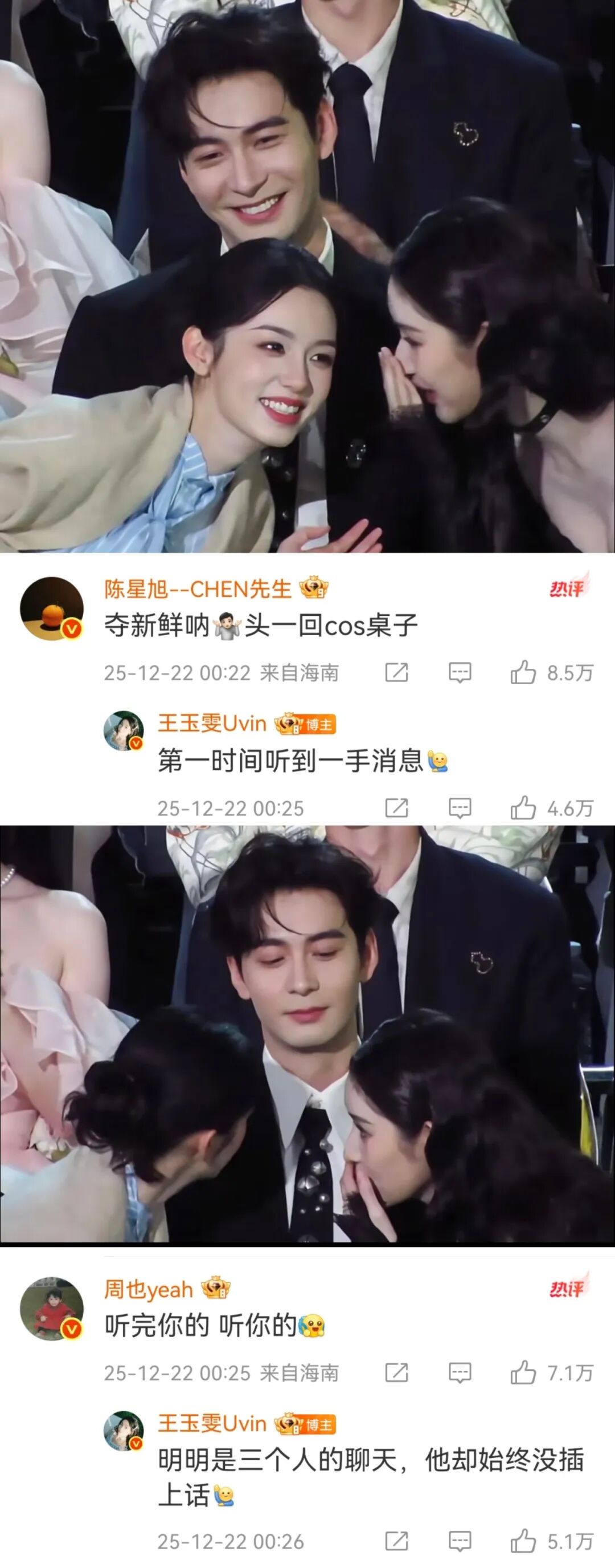 两位美女一见如故,隔着中间的陈星旭聊得热火朝天,你看陈星旭的嘴角和眉眼!完全不同于经常在剧里看到的冷酷霸总了。