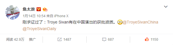 But 昨日微博音乐达人“鱼太浪”传出喜讯,爆料:澳洲流行男歌手戳爷Troye Sivan有演出获批资质,有望来华演出。一经披露,粉丝圈里掀起了轩然大波,因性向“不合”而无缘巡演的忧虑烟消云散。你看,Adam Lambert不也在好声音的舞台上卖得一手好“骚”吗?