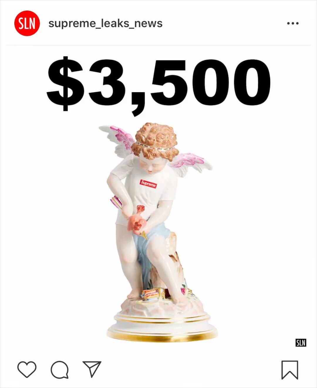 自从Supreme公布了2019年春夏系列的单品和配件后,其中丘比特的热度占据着很高的位置。INS账号@supreme_leaks_news称这个与Meissen联名的丘比特瓷像,发售货量极少,而价格也会高达3500美元...如果成为事实,你还会想办法购入吗?