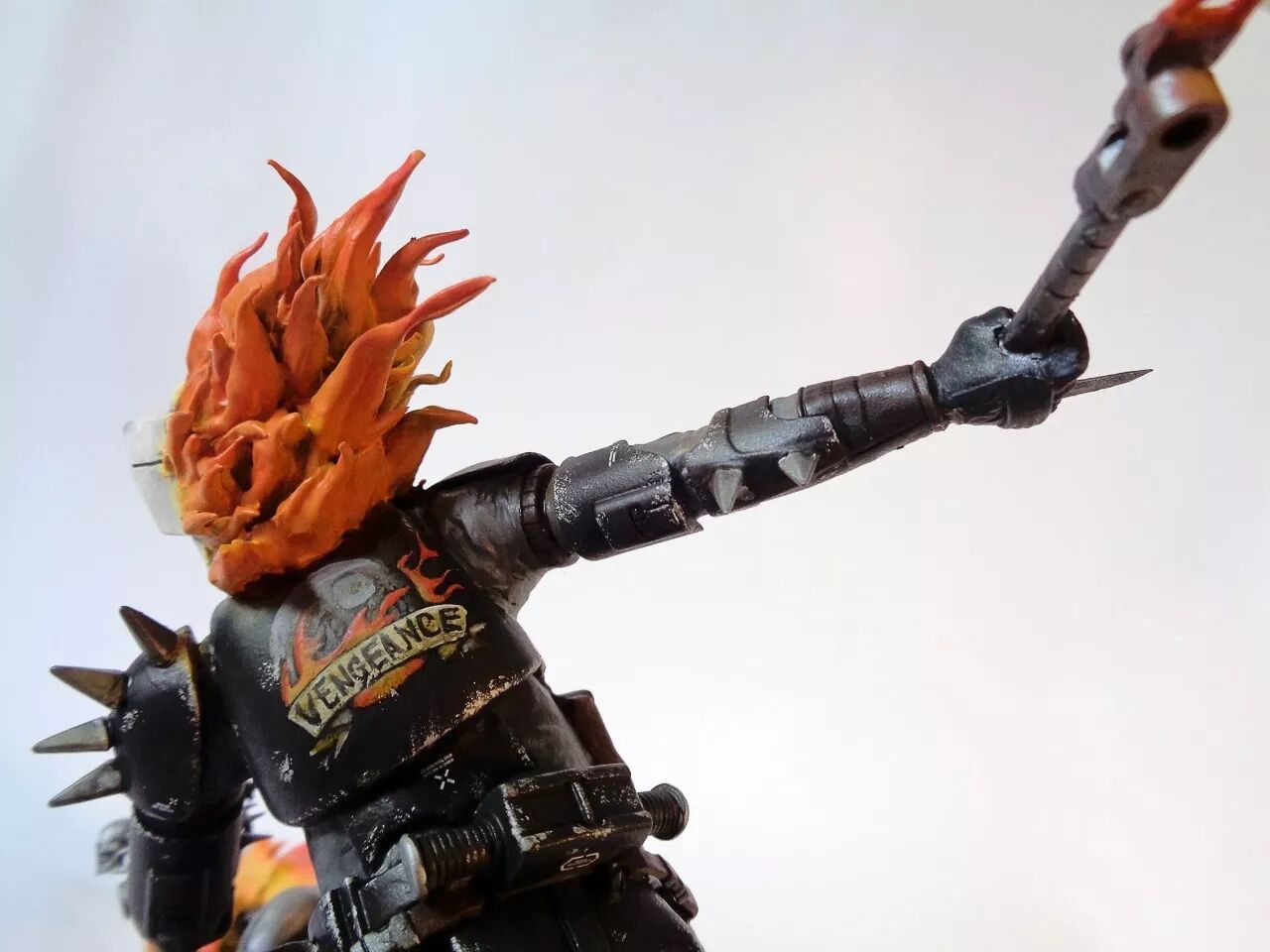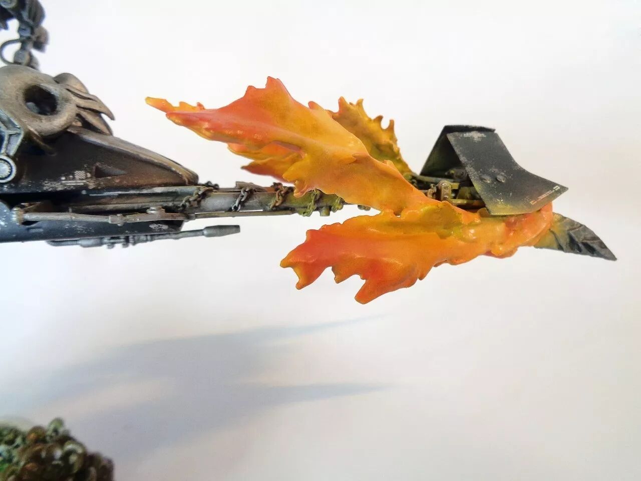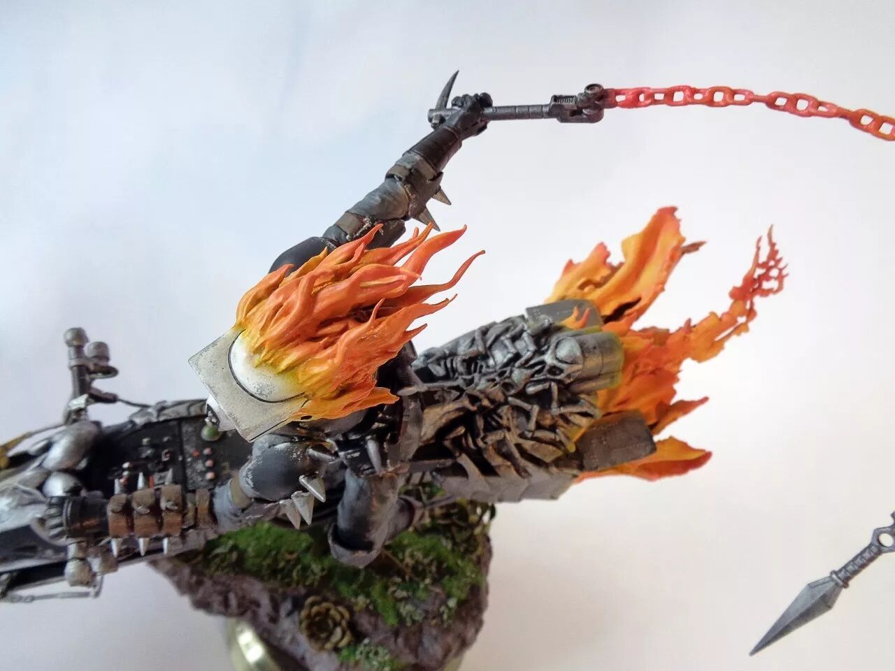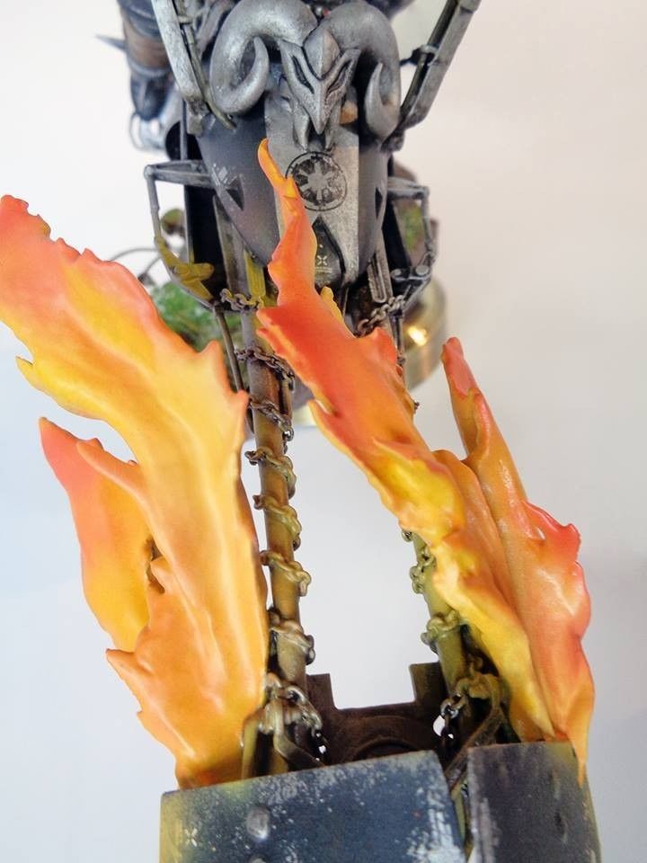再往下看,就是这烈火战车了,不对,应该是烈火飞车,引擎后边喷涌而出的火焰特效很是带感,火焰附近的链条也有烧红的效果,车头并未按照画稿来制作,而是把骷髅头改成了更尖锐的模样,并且打上了标志,显得机械感更强,更精细。操纵杆和仪表盘一应俱全,所有按钮都有刻画,真的是不得不服气