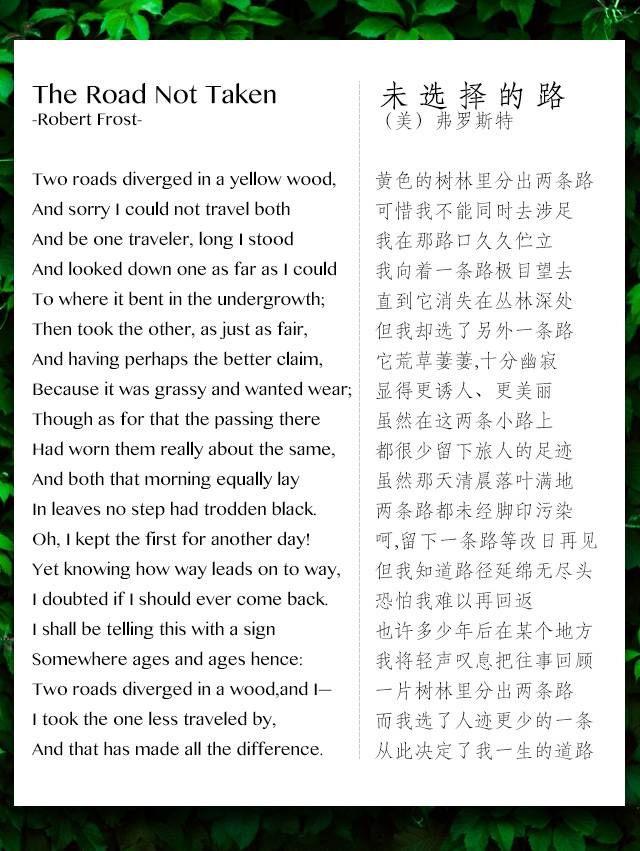 《未选择的路》是美国诗人罗伯特·弗罗斯特的作品。这首诗看似在写自然界的道路,但实质上却是在说我们的人生之路。