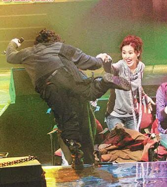 还好没受伤,坚强地站起来继续唱!