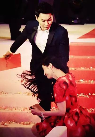 马伊琍参加大学生电影节时摔倒,马伊琍作为开奖嘉宾不慎滑倒,身旁的胡歌被她拽倒在地。PS:老胡也有洗剪吹的发型啊