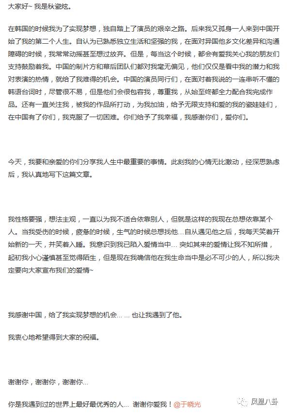 其实撇开节目来看,两人的恋爱一直都是很甜蜜的。2015年9月,秋瓷炫在微博发长文大方公布恋情,随即于晓光转发并深情表白:你是答案。