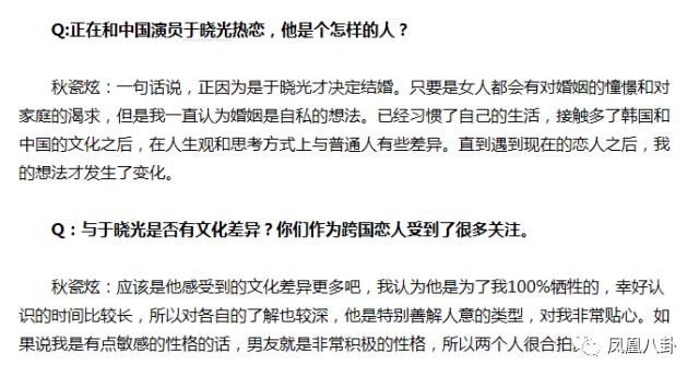 在2016年的一次采访中,秋瓷炫也大方回答了感情问题,大赞男友于晓光贴心、善解人意: