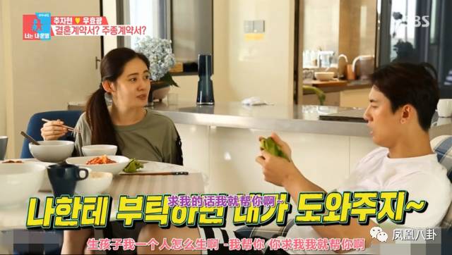第二天的早饭,秋瓷炫做了辣炒猪肉但是没有青菜。谁知于晓光不愿意了:“怎么没有青菜呢?要用青菜包着吃啊!”还质疑起老婆的国籍:“你是不是韩国人呀?”
