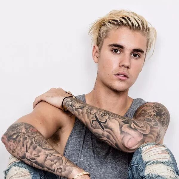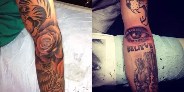 Justin Bieber 的花臂其实也受到 Chris Brown 的影响,他们一度曾经玩得非常亲密,就算连穿着打扮的风格也一样。而丁日的花臂的图案大多数还是以卡通为主,当中包含了录音机,小丑,8号球等。