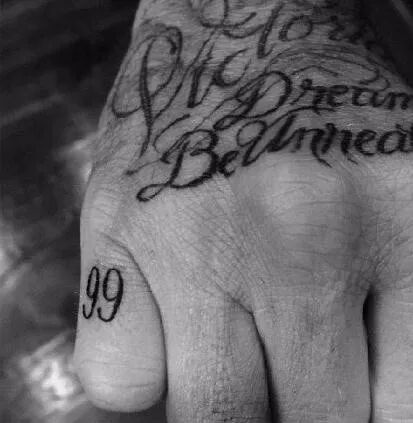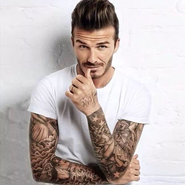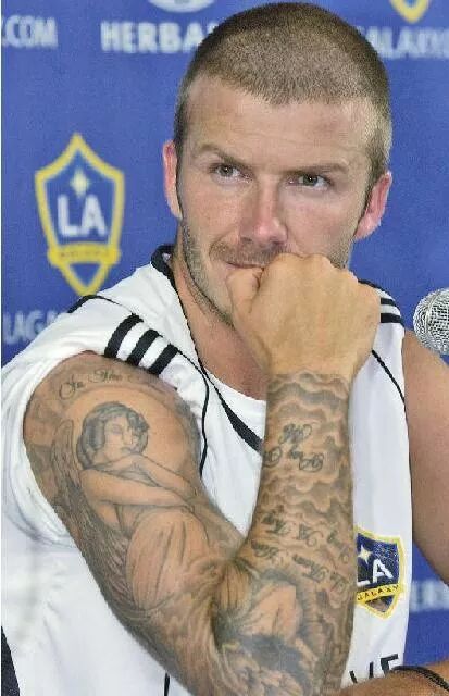 男神 David Beckham 自从去了洛杉矶银河队之后,本来身上只有几个象征性的纹身便逐渐开始增多,并慢慢形成了花臂,然而大部分图案的主题都是以家人为主,其中包括了妻子维多利亚的女神像。