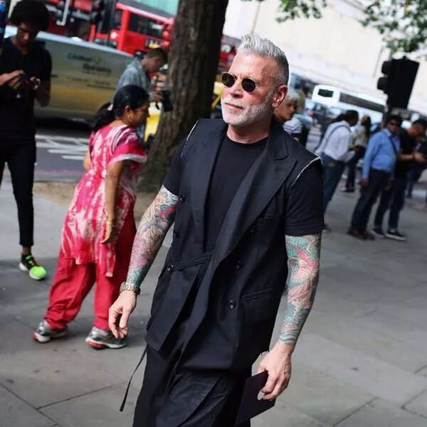 NickWooster 除了穿衣搭配值得关注之外,在夏季两只花臂更充当着搭配的主角,毕竟要露出手臂。Nick 大叔的纹身充满了日本风格,红绿的配色有点像日本黑帮的效果。