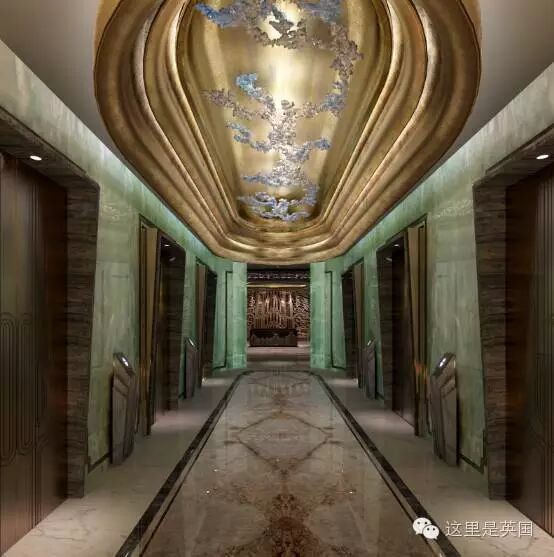 看看这气派,地面与顶部都是琉璃、玉石装饰的呢,据说为了这一家酒店,就开采完一整个矿山的矿石,听来觉得很不可思议。