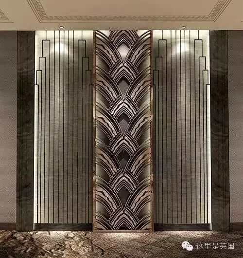 酒店内部设计师采用几何的、纯綷装饰的线条来表现,如扇形辐射状的太阳光、齿轮或流线型线条、对称简洁的几何构图将ArtDeco风格展现的美奂绝伦!