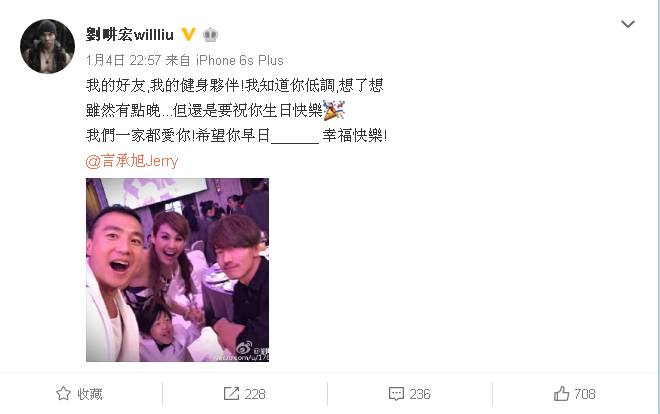 原来是刘畊宏昨天发了一条给言承旭庆生的微博,
