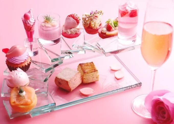 日本产草莓和樱花,构成的粉色下午茶。甜点都以粉色系为主,有马卡龙,樱花花瓣慕斯蛋挞等等,除了草莓和樱花之外,还使用了被称为第四种巧克力的“RUBY巧克力”,颜值和味道看上去都超级棒。其中还有一款鸭肉加草莓的三明治,这种神奇的组合莫名地有点想试试呢。