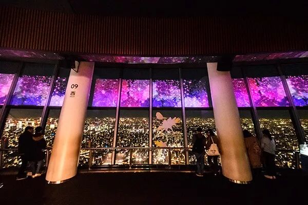 这是天空树每年都会举办的活动,以天空树展望台约110米,高约2米的玻璃窗为屏幕,用光影给塔内带来春天的气息。可以一边眺望东京的夜景,在音乐中体验让你如同身临其境的美丽映像。
