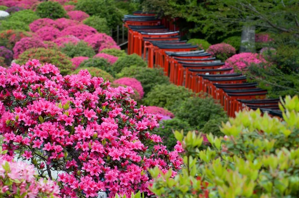 春天可不是只能赏樱,根津神社的杜鹃花也开得正好。高低起伏的根津神社共有6600平方米,一到春天100多种3000多株杜鹃花争相绽放。颜色各不相同的杜鹃花漫山遍野,和千本鸟居相搭配更是满满风情。杜鹃祭期间中还会有小摊点、跳蚤市场、甘酒茶屋等展开。除了杜鹃花,根津神社中7处社殿也被指定为国家重要文化财产,园内都是看点哦。
