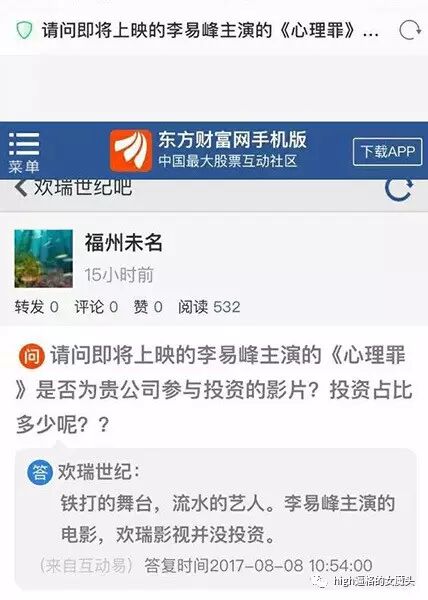 作为欢瑞世纪股东之一的他,为公司带来了哪些商业价值,作为李易峰重要转型时期的作品《心理罪》,欢瑞为何没有出现在电影出品人的队列里?