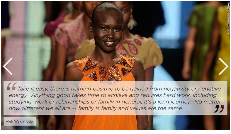 Alek Wek is a Sudanese(苏丹的)-born supermodel who has taken runways by storm since emerging on the world's fashion scene in 1994. Since 2002, she has been an ambassador(大使、代表) for the United Nations High Commisioner for Refugees(联合国难民事务高级专员办事处). She told CNN,"My mother had nine children, and raised us through two civil wars(内战)and raised us through exile(流放), she has always had great strength and has always been so resilient(有弹力的,适应力强的), and her resilience when I look back is humbling. She always made us feel safe, she always just got on with things and protected us."