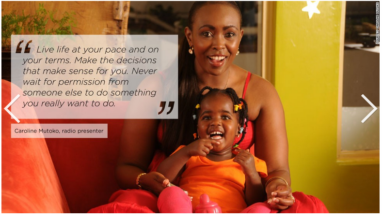 Caroline Mutoko is an influential radio presenter on Nairobi's(内罗毕,肯尼亚首都) Kiss 200 FM radio station, part of the Radio Africa brand. She is pictured with her young daughter Nduku.